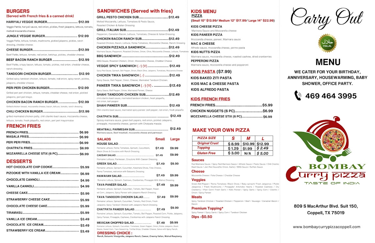 Introducing the delectable menu of Bombay Curry Pizza - Coppell, where Indian flavors meet traditional pizza in a delightful fusion. Nestled at 809 S MacArthur Blvd, this pizzeria offers an enticing range of veggie and meat pizzas that reflect the rich culinary heritage of India.